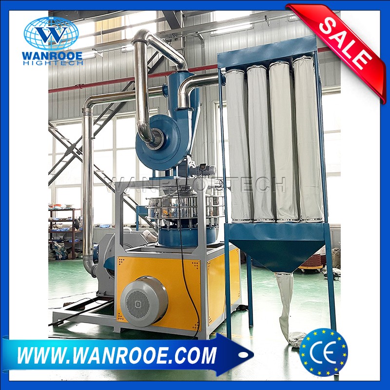 La máquina pulverizadora de plástico se compone principalmente de motor eléctrico, cuchilla tipo disco, ventilador de alimentación, tamiz vibratorio, sistema de eliminación de polvo, etc.