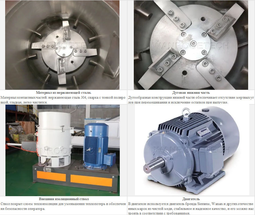 Помещая отходы в корпус горшка машины, материал быстро разрезается за счет высокоскоростного вращения, поворота лезвия и сдвига фиксированного лезвия, затем материал передвигается вдоль стенки корпуса горшка с помощью функции центробежной силы ножевой тарелки, одновременно, материал поворачивается вверх и вниз с помощью лопасти и со всех сторон перемещается к центру корпуса горшка. Трение самого материала, а также трение стенок и лезвий производят большое количество тепла при трении на высокой скорости, в результате чего температура материала повышается до полупластического состояния и соединяется с небольшим комком. Прежде чем материалы заблокируются, на материал распылится количественная вода предварительной подготовки. Холодная вода, соприкасающаяся с горячими материалами, быстро газифицируется и отводит поверхностное тепло, благодаря чему поверхность материалов быстро охлаждается и избегает образования комков, а затем после эффекта дробления между вращающимся лезвием и неподвижным лезвием разрезается на частицы (материалы нестандартного размера). Во время дробления также могут присоединяться соответствующие цветные пигменты в соответствии с потребностями.