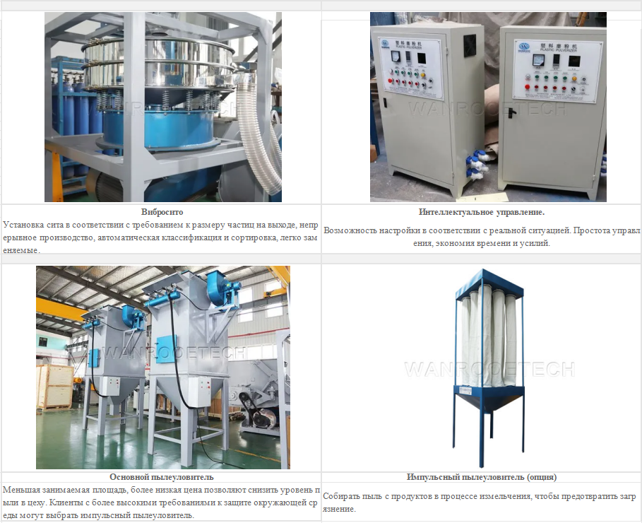 Комплект мельницы состоит из двигателя, роторных ножей, системы подачи, вибрационного грохота, пылеуловителя и т.д. По запросу доступны такие периферийные оборудования как преобразователь, ваккумный загрузчик, шнековый питатель, магнитный улавливатель, сепаратор для разделения метталов, импульсный пылеуловитель, дозатор и т.д.