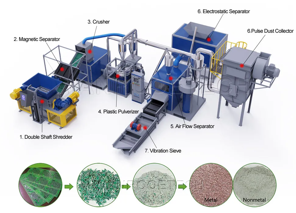 Мельница для измельчения кусков печатной платы относится к серии PNMP. Данная мельница используется как третий этап переработки доски PCB. Машина характеризуется высокой производительностью и низким энергопотреблением. Мельница серии PNMP предназначена для производства порошка ПЭ, ПВХ, ПП, ПС, АБС, нейлона, ЭВА, ПЭТ и других метераилов. Она является периферийным оборудованием для утилизации печатной платы и алюминиево-пластиковой отходов. Машина играет роль в производстве порошка, что обеспечивает удобство для разделения пластика и металла.
